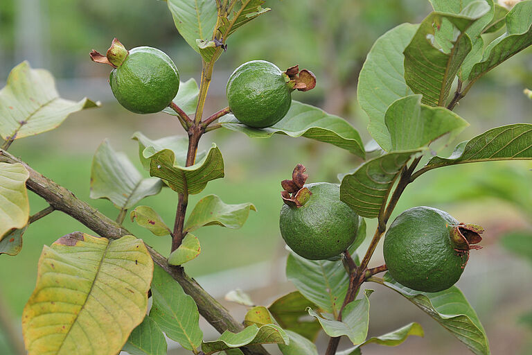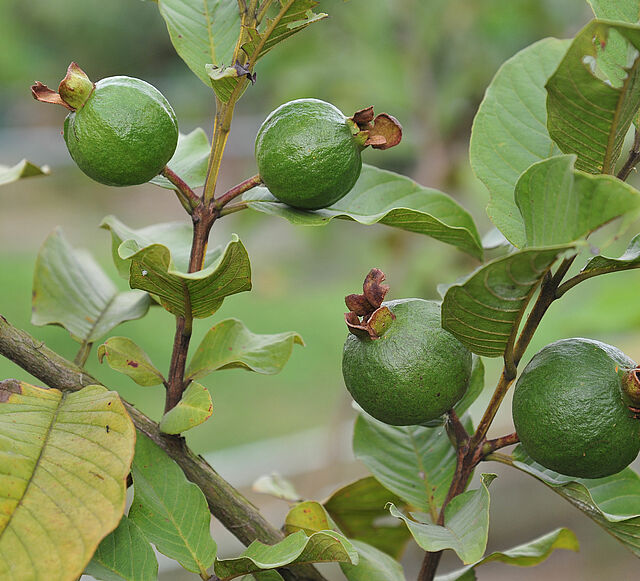 Esta popular fruta tropical, originaria de México, Centroamérica y Sudamérica, se cultiva en muchas regiones tropicales y sutbropicales. El guayabo o la guayaba manzana es un fruto de piel amarilla o verde brillante de un árbol pequeño, la Psidium guaiava, perteneciente a la familia de las mirtáceas. El color de la pulpa del fruto varía del blanco roto al rosa brillante y el fruto tiene una longitud de 4 a 12 cm. Su sabor va de muy dulce a agrio.