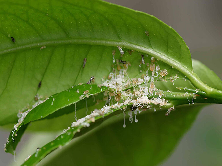 El psílido es un insecto succionador que introduce su aparato bucal en el tejido vegetal para alimentarse. Los adultos se alimentan de tallos jóvenes y de hojas en todas sus fases de desarrollo. Las ninfas se alimentan de las hojas y tallos jóvenes, segregando continuamente grandes cantidades de melaza y una sustancia cerosa parecida a filamentos. Sobre esta melaza se desarrolla negrilla. Dañan los cítricos quemando los brotes nuevos o provocando que las hojas se enrollen o rasguen a medida que maduran. Los daños más importantes se producen cuando el insecto es el vector de la bacteria Candidatus Liberibacter asiaticus, que provoca una enfermedad que destruye los cítricos y recibe el nombre de enverdecimiento de los cítricos o Huanglongbing (HLB). Las ninfas o adultos del psílido transportan la bacteria en sus cuerpos después de alimentarse de las plantas infectadas por la bacteria y de este modo propagan la enfermedad al visitar una planta sana e inyectar la bacteria en esta cuando se alimentan. La enfermedad puede matar a un árbol cítrico en el plazo de cinco años y no existe un tratamiento de cura.